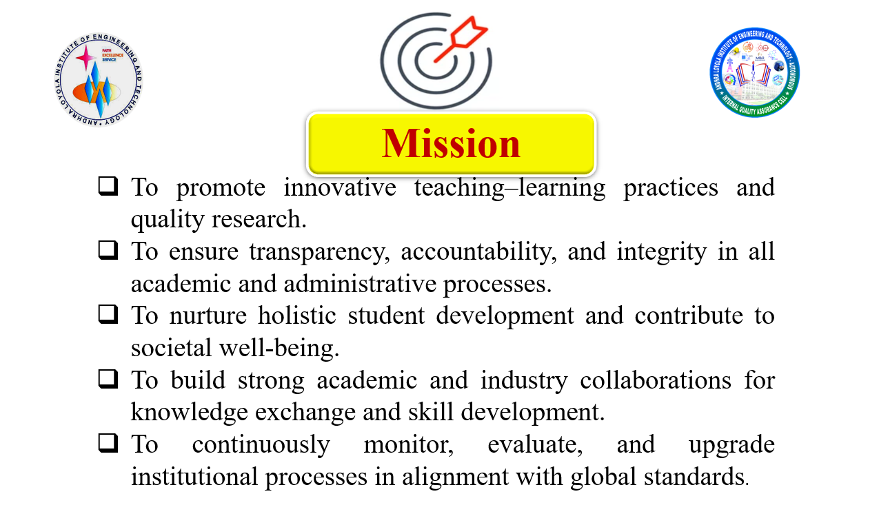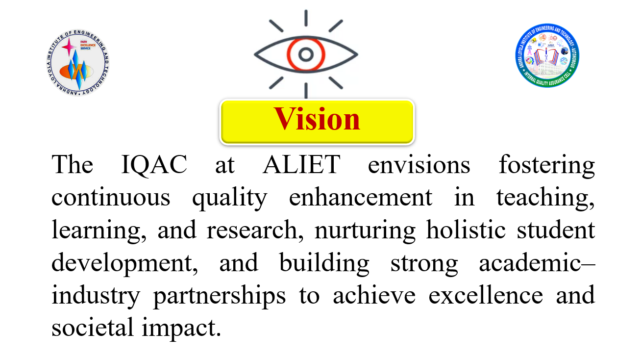 The Internal Quality Assurance Cell (IQAC) at Andhra Loyola Institute of Engineering and Technology (ALIET) serves as the cornerstone for promoting and sustaining quality in every facet of institutional functioning. Established in accordance with the guidelines of the National Assessment and Accreditation Council (NAAC), the IQAC plays a strategic role in fostering a culture of excellence, innovation, and continual improvement across academic, administrative, and co-curricular domains.